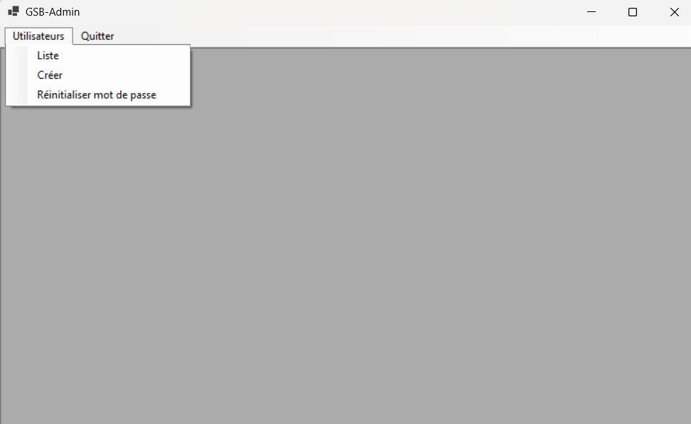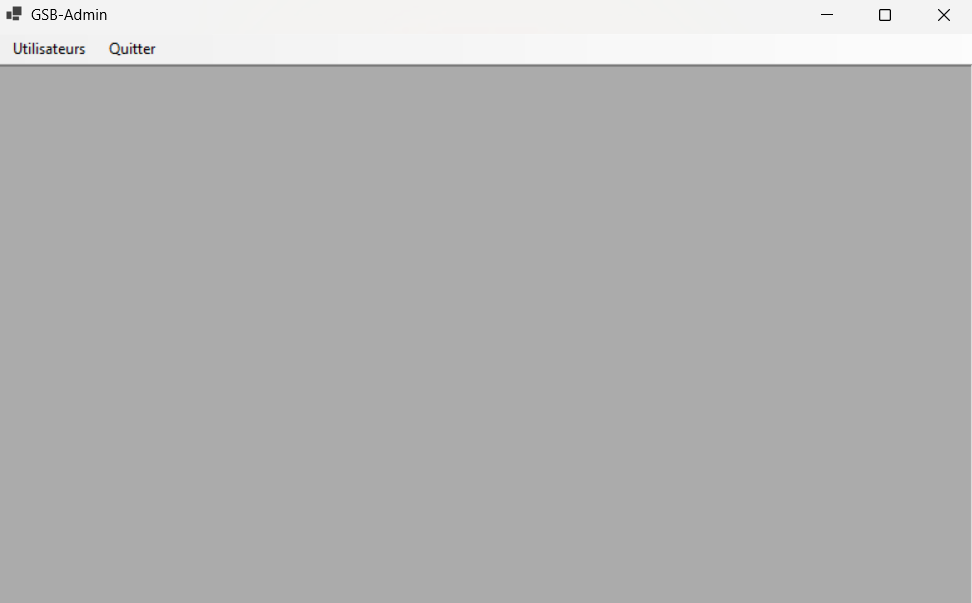 Une fois connecté, j'arrive sur la fenêtre principale de type MDI. La barre de menu donne accès aux différentes fonctionnalités via le menu "Utilisateurs" et permet de quitter proprement l'application.