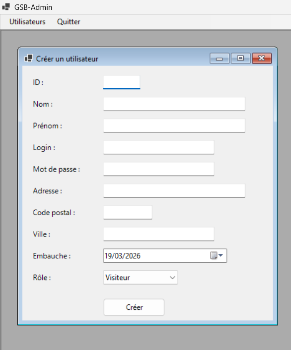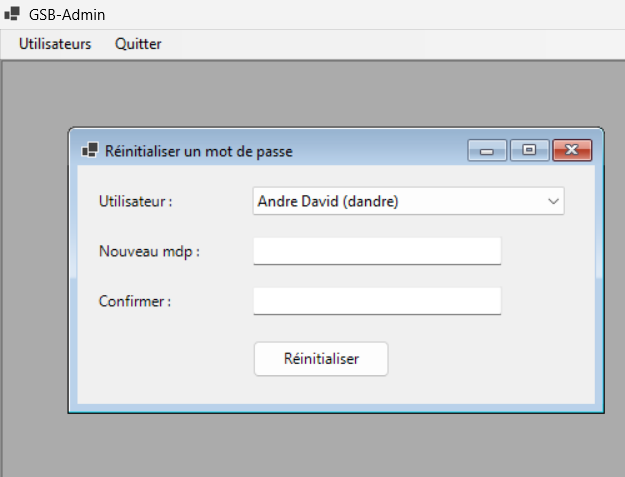J'ai conçu cette application comme complément à l'application web Laravel de gestion des frais utilisée par les visiteurs et comptables. Via GSB-Admin, je peux consulter la liste des utilisateurs, en créer de nouveaux avec un rôle spécifique, et réinitialiser les mots de passe de manière sécurisée avec hachage SHA256.