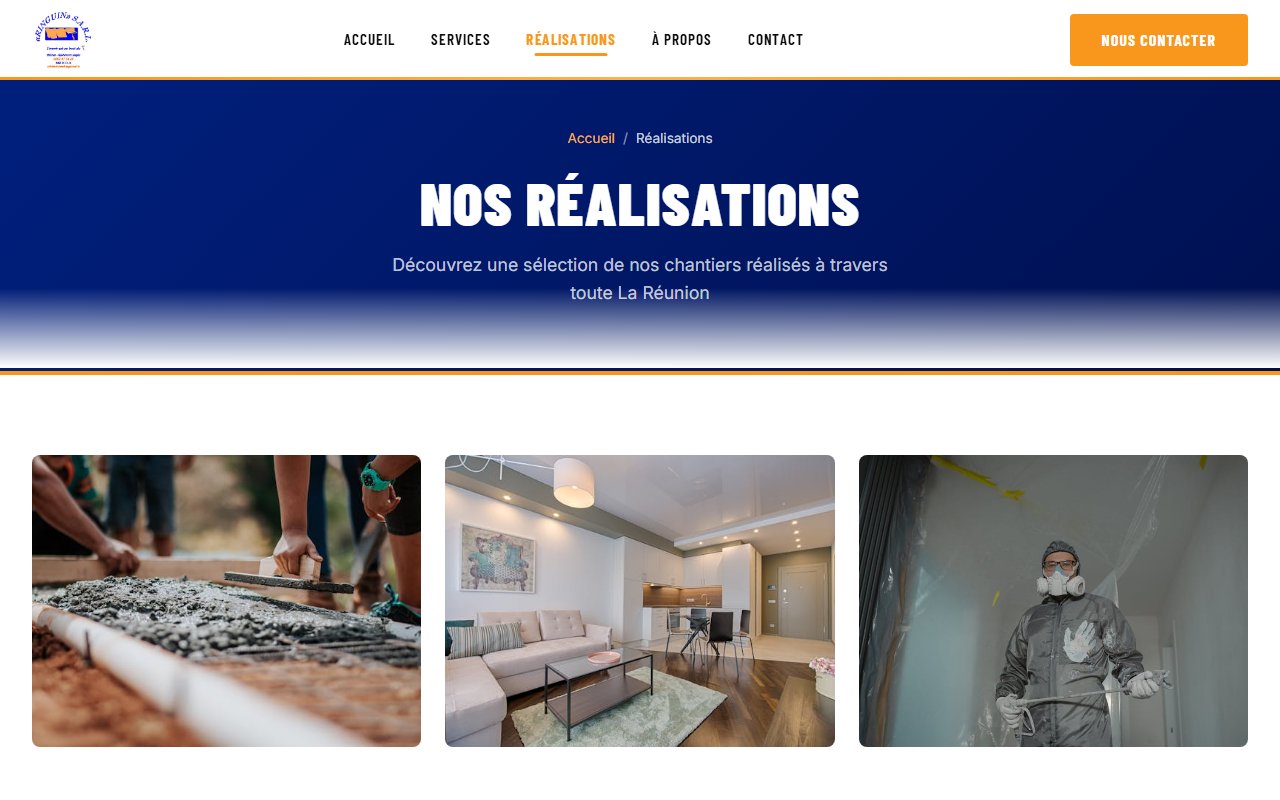 RINGUIN S.A.R.L. est une entreprise de peinture, revêtements de sols souples et ravalement de façades basée à Saint-Denis de La Réunion depuis 1990. Le projet consistait à créer un site web moderne et professionnel reflétant plus de 35 ans d'expertise, avec une identité visuelle forte aux couleurs bleu marine et orange.